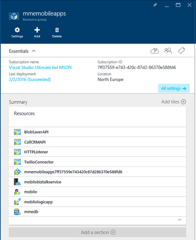 The new ARM deployment model introduced the concept of resource groups. resource groups are logical containers that contain your Azure components and services. The picture below shows one of my applications that contains a total of nine different components, such as API Apps, a mobile app, a Logic App, a database and an Application Insights instance. The idea is that we can now group these components into a resource group called “mmemobileapps”. When we enter the portal we can just open our resource group “mmemobileapp” and have all our stuff at hand. This makes it possible to have several Azure applications consisting of different components and services and avoid having a total mess in the end. Every resource in Azure can only be assigned to one single resource group.