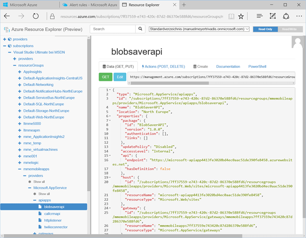 The ARM model is based on a REST API that can be used to create, delete and modify Azure resources. In the Azure Resource Explorer in the picture above we can find the URIs required to access a certain resource and we even have buttons to invoke a GET, POST or PUT request to the API directly from the browser.
